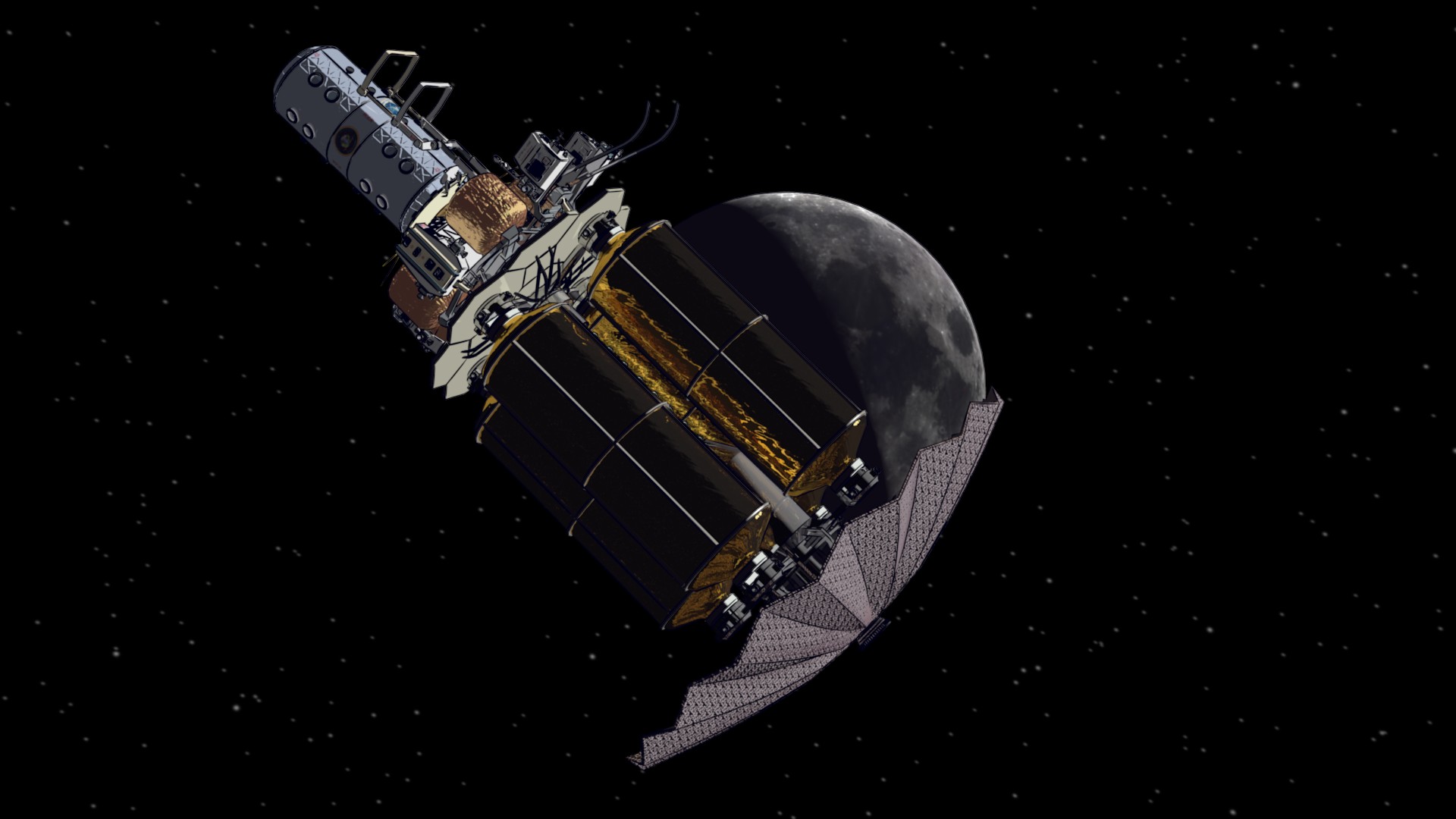 March 2015 Desktop Wallpaper, featuring the Lunar Transportation System Moon Shuttle coasting to the Moon. Model by Chris Kuhn. Design by Terry Hancock.