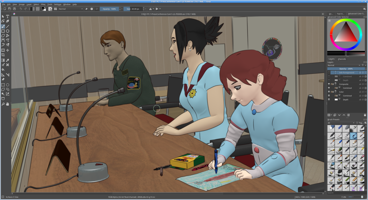 Over the weekend, I decided to try rendering to Multilayer EXR, rather than PNG. I just rendered a couple of frames, but I wanted to get an idea of what it would be like. I found I was able to open the resulting image in Krita, as you can see here (note the layers menu on the right side). The most obvious thing was that I could turn the ink lines on and off by just changing the layer visibility.