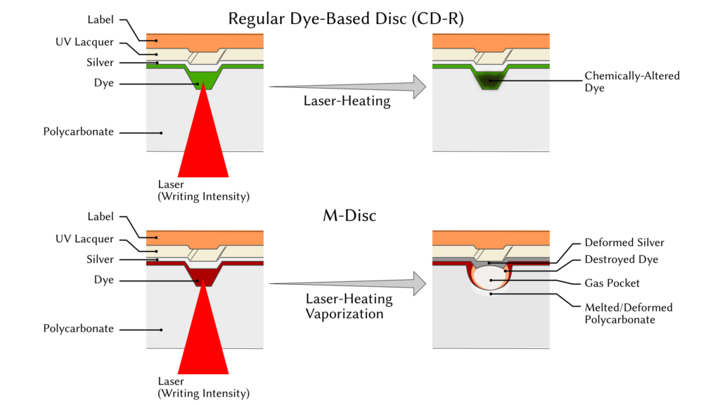 Comparison of the writing mechanism for conventional dye-based disc media and M-Disc media. The dye used in the M-Disc is intended to vaporize when written, creating a small gas pocket, by contrast to the chemical change that happens in normal dye-based discs. This physically alters the disc, so it is much less reversible.