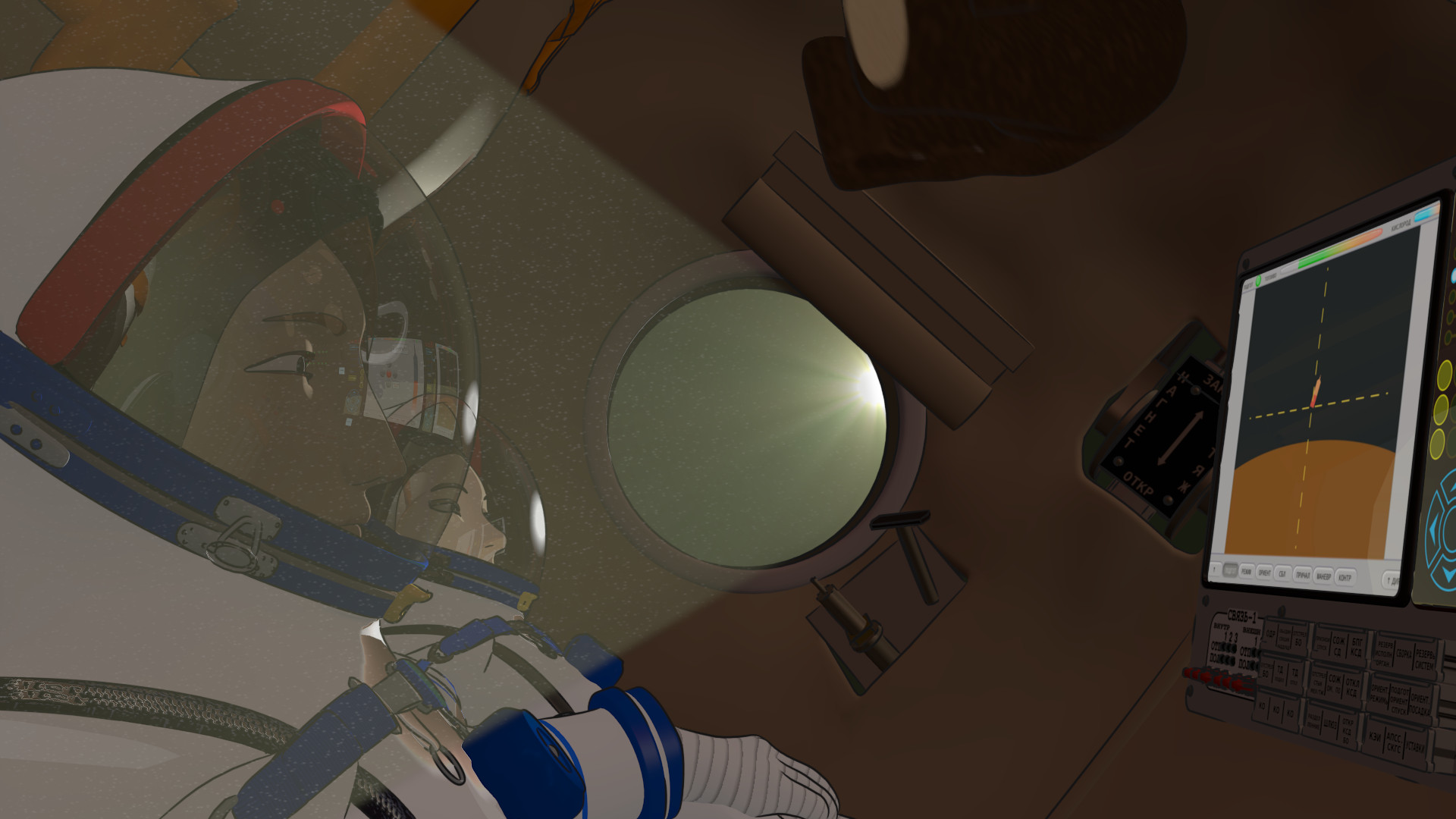 At the end of March, I began working (finally) on the remaining shots that need to be recreated in the SF-1 file — the character action in the Soyuz in the Soyuz Flight sequence at the end of the episode. I look-tested and created what I think is a good effect for the “sunbeam” shining into the spacecraft. Most of the effect is done with compositing, so I’ll actually be able to tweak it more after animating and rendering.