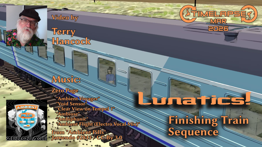 This month was mostly focused on production work for Lunatics. I recreated the TR-2-A shot that transitions from the train wheel (after fading from the full Earth), across reflected landscape with camels, to Georgiana Lerner’s face looking out the window of the train. Then I assembled this with the rest of the scene with the existing shots. I re-rendered with an updated railway set. I composited those files and re-assembled the whole scene in Kdenlive. There is still one remaining problem in the scene, which is some missing lipsync.